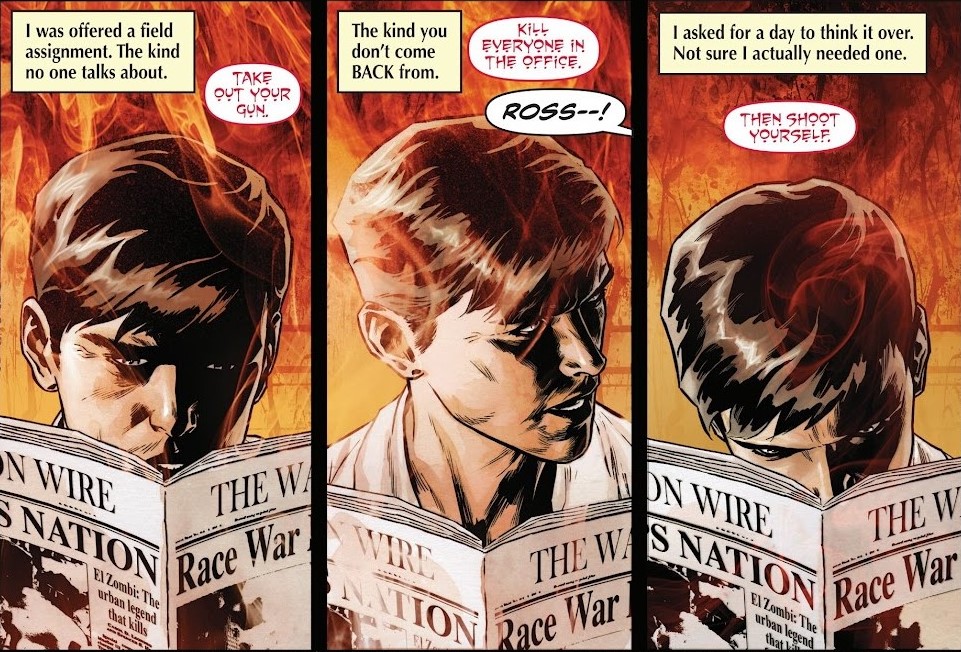 En medio de todo aparece una figura inesperadamente central: Everett K. Ross. Priest decide convertir al antiguo diplomático en el eje del número, y lo hace mostrándolo en distintas etapas de su vida. Lo vemos como un narrador envejecido que recuerda acontecimientos decisivos, como un funcionario atrapado en una vida gris y también como un hombre involucrado en operaciones peligrosas lejos de la mirada pública. Este Ross es cínico, sarcástico y profundamente cansado del mundo. Su voz guía entre fragmentos de historia que parecen no encajar del todo al principio. Hay menciones a una guerra racial, a una droga de control mental, a conspiraciones que apenas se insinúan y a misiones de las que nadie vuelve. Priest siembra ideas por todas partes, pero rara vez se detiene a explicarlas. Esa es probablemente la mayor virtud y el mayor problema del cómic. La historia funciona como un puzle incompleto. Cada escena añade información, pero también nuevas preguntas. Avanzamos con la sensación de que hay una gran historia detrás de todo… aunque todavía esté oculta entre las grietas del relato.