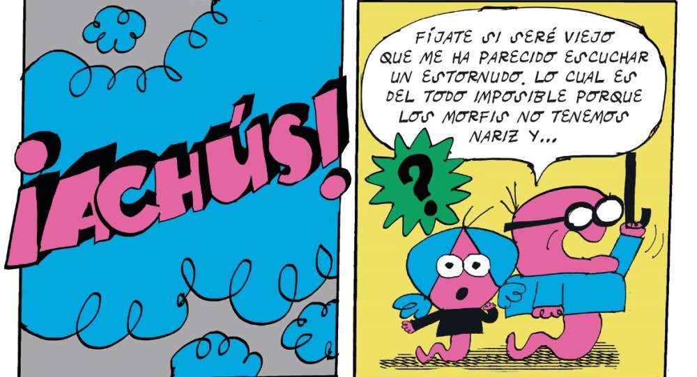 En un tranquilo pueblo donde todo parecía ir con la normalidad habitual, hasta que alguien estornuda. Un detalle sin importancia, salvo por un pequeño problema: los morfis no tienen nariz. Así arranca el primer volumen de «Los morfis» la disparatada aventura creada por Lorenzo Montatore, donde un huevo gigantesco, un pato y una culebra cascabelera con inquietantes gustos culinarios convierten un día cualquiera en una comedia cósmica llena de imaginación y humor absurdo. Así que cuando nuestros protagonistas escuchan un “¡ACHÚS!” viniendo del exterior, el universo entero entra en crisis. ¿Quién estornuda? ¿Cómo? ¿Por qué? ¿Es el fin de la física tal y como la conocemos? ¿O simplemente alguien ha abierto una ventana cósmica hacia el absurdo? Lo que encuentran en el jardín no ayuda precisamente a resolver el misterio.