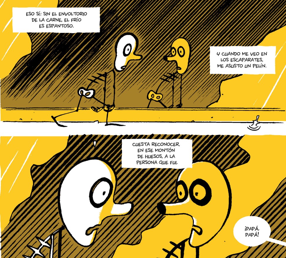 En ese momento es donde Brocal empieza a sacar la artillería pesada del humor, porque cualquiera que haya enviado algo a una editorial (sea un cómic, una novela o una receta de croquetas revolucionaria) sabe que ese silencio duele más que el atropello inicial. Y el protagonista lo tiene clarísimo: no puede morirse sin recuperar ese cómic. No puede permitir que su obra se quede olvidada en un cajón, acumulando polvo y frustración. La Muerte, que en esta historia tiene más curiosidad que prisa, accede a un trato que huele a desastre desde el minuto uno: le deja volver al mundo de los vivos para recuperar las páginas, con la condición de que luego se las lleve para leerlas juntos. Porque claro, hasta la Muerte tiene derecho a un buen cómic o libro (que gran referencia al querido Terry Pratchett). Así empieza esta aventura delirante en la que nuestro protagonista regresa, pero en versión esqueleto. Nada de cuerpos perfectos ni resurrecciones épicas: aquí hay huesos, ojeras inexistentes y una dignidad bastante cuestionable. A partir de ese momento, este tebeo se convierte en una especie de thriller de barrio con aroma a serie B, pero con cerebro de autor que sabe exactamente lo que está haciendo. Hay investigación, hay sospechas, hay compañeros de estudio que no parecen trigo limpio, y sobre todo hay una sensación constante de que algo no encaja del todo. Porque recuperar el cómic no va a ser tan fácil como abrir un cajón y decir “aquí está mi legado, gracias por esperar”.