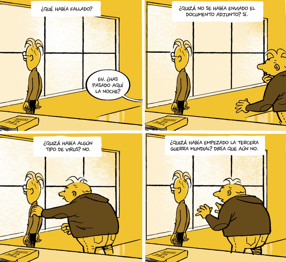 Aquí es donde este comic da un pequeño giro que, sin dejar de ser divertido, añade una capa extra de profundidad. Porque más allá de los chistes y las situaciones absurdas, hay una pregunta flotando en el aire: ¿qué queda de nosotros cuando desaparecemos? ¿Nuestras obras? ¿Nuestros intentos? ¿Nuestros emails sin respuesta? Brocal no da una respuesta clara, y hace bien. Prefiere seguir jugando, seguir contando, seguir haciendo reír. Pero deja esa sensación ahí, como quien no quiere la cosa, para que el lector la recoja si le apetece.