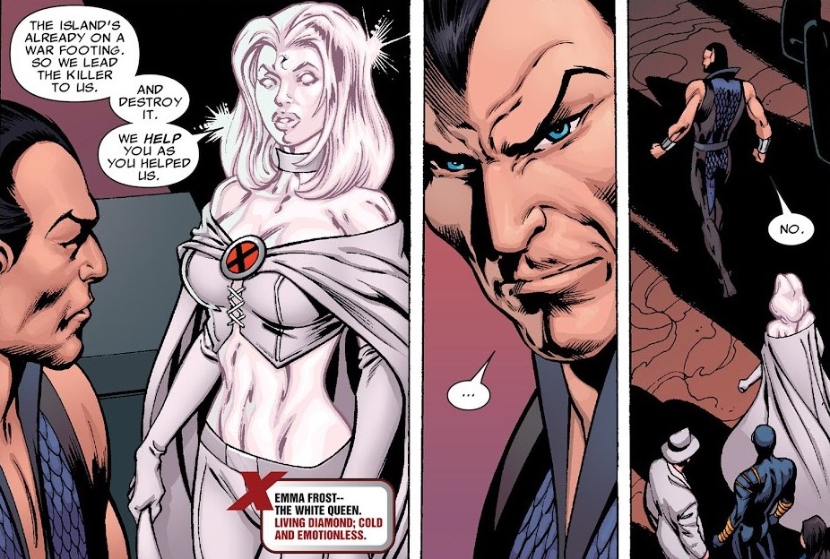 La Patrulla-X ya no es un grupo. Es un experimento. Un país improvisado sobre una isla que suena a utopía, pero huele a trinchera. Bajo el liderazgo de Cíclope, los mutantes han dejado de pedir permiso para existir. Han decidido existir sin más. Y claro, eso nunca le ha sentado bien al resto del mundo. Scott Summers ya no es ese chico responsable que seguía las reglas de Charles Xavier. Ahora es un estratega con ojeras, alguien que entiende que cada decisión cuesta vidas y aun así hay que tomarla. Su evolución es uno de los pilares más fascinantes del tomo. No porque se vuelva más poderoso, sino porque se vuelve más frío. Más práctico. Más peligroso. Y eso se nota especialmente en uno de los momentos más brillantes del volumen: su viaje a la mente de Emma Frost.