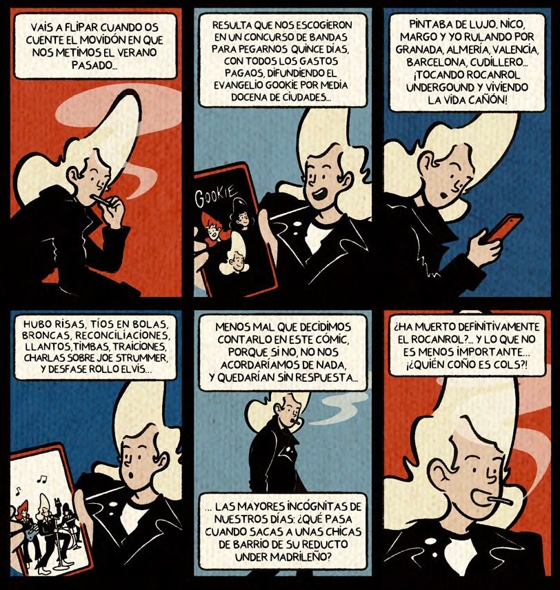 Es en esa amalgama donde tiene razón de ser Cols, la protagonista del cómic. Con su tupé tan imposible como magnético. En pleno 2026 y con actitud rockera, en un Madrid que ya no es el que era, pero donde se sigue tocando rock tanto en salas como en locales de ensayo. Por mucho que no tengan el eco mediático de antaño, los acordes de las guitarras siguen sonando, junto al bajo y batería, por amplificadores de muchos lugares del foro.