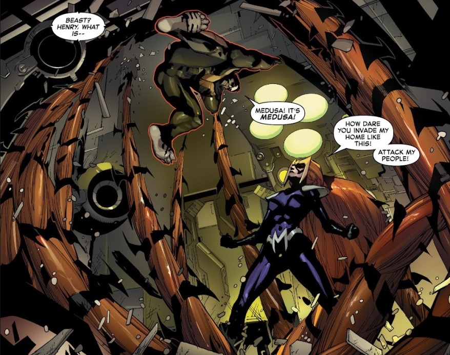 Los encargados de escribir este pequeño festival del caos son Jeff Lemire y Charles Soule, que básicamente hacen de portavoces de cada bando. Lemire se encarga de los mutantes, con ese tono de tragedia constante que ya es marca de la casa: especie perseguida, ahora literalmente asfixiada por el planeta que habita. Soule, por su parte, defiende a los inhumanos como si estuvieran protegiendo su último trozo de identidad cultural. Porque para ellos, la nube no es negociable. Es su pasado, su presente y su futuro. Es como si te dijeran que tienes que destruir lo que más quieres para salvar a otra especie. A ver quién es el guapo que acepta eso sin rechistar. Y aquí está la gracia del asunto: ambos tienen razón. Los mutantes no pueden sobrevivir si la nube sigue ahí. Los inhumanos no quieren renunciar a lo que los define como pueblo. Es un conflicto perfecto que se resuelve de la manera menos perfecta posible: a golpes.