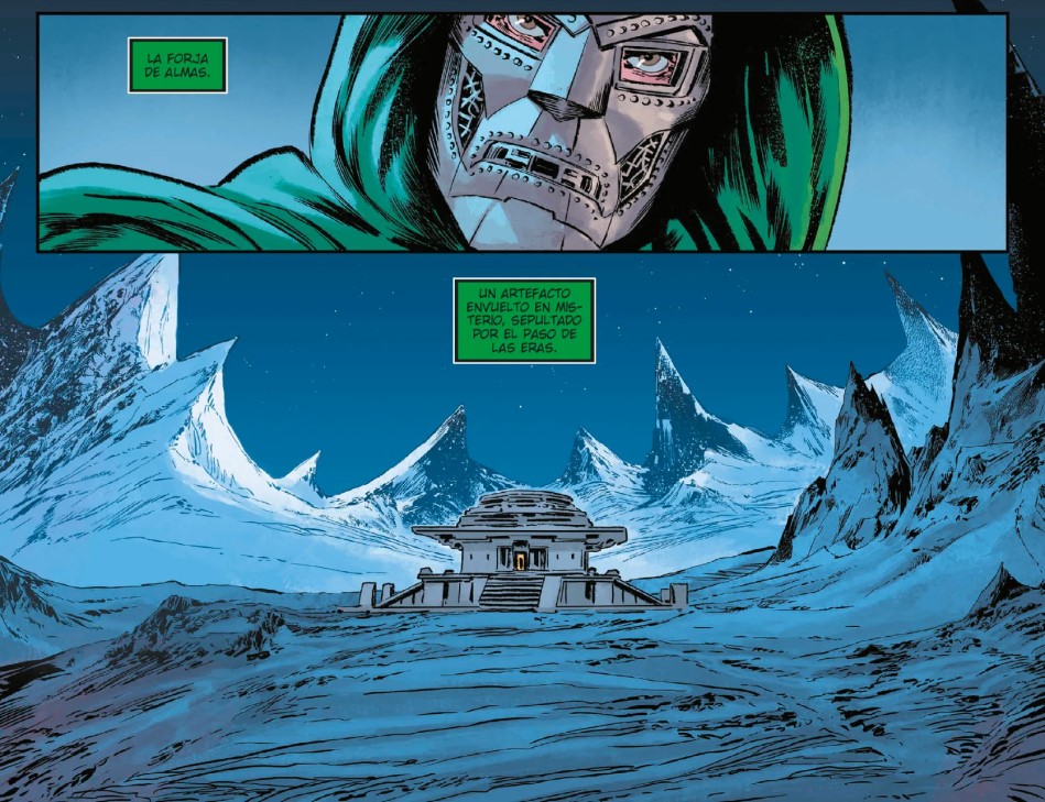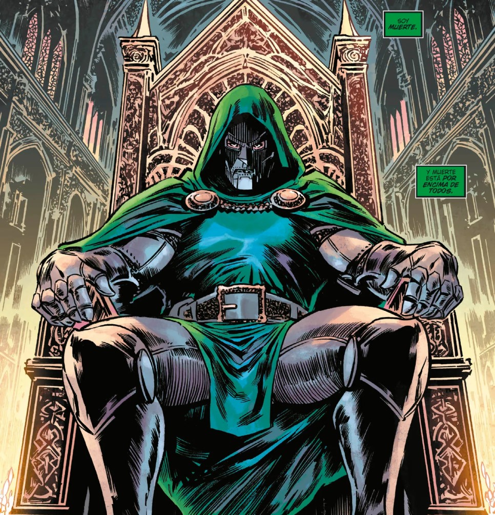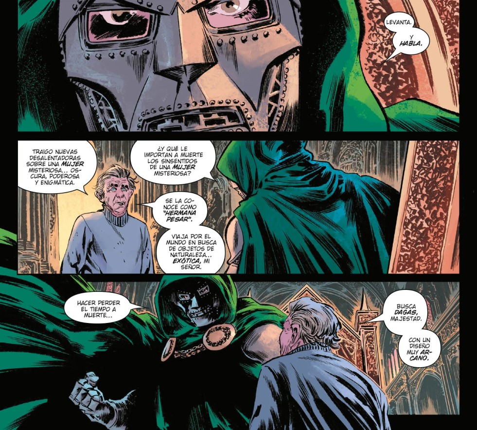 El hilo conductor de todo este caos lo marca Mefisto, que decide que el infierno ya no le basta. Controlar las almas de los condenados es, a estas alturas, un entretenimiento menor para alguien con su ego y su hambre de poder. Así que da un paso más allá y plantea un plan que suena tan descabellado como irresistible: hacerse con las almas de toda la humanidad. Para ello recurre a artefactos místicos, rituales antiguos y a una figura clave, la Hermana Pesar, una creación reciente que funciona como engranaje emocional y narrativo de la historia. Su presencia añade una capa de tragedia y manipulación que equilibra, en cierta medida, el festival de maldad pura que domina el tomo. Pero claro, cuando hay poder en juego, hay un nombre que siempre aparece tarde o temprano: Doctor Muerte. Y cuando Víctor entra en escena, todo cambia. Porque no estamos hablando de un villano más, sino de alguien que no acepta ser una pieza en el tablero de otro. Su participación eleva automáticamente el nivel del conflicto, convirtiendo lo que podría ser un simple plan demoníaco en una auténtica guerra de egos. Muerte no reacciona: impone. No duda: ejecuta. Y cada una de sus apariciones está cargada de ese carisma arrogante que lo convierte en uno de los personajes más fascinantes de Marvel.
