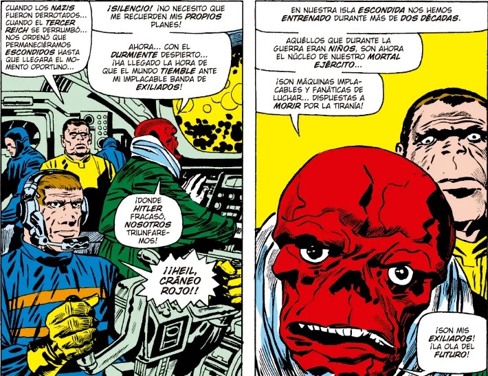 La primera mitad del tomo está dominada por la saga del Durmiente, una historia que resume a la perfección el espíritu de la época. La premisa es tan sencilla como desmesurada. Un arma definitiva creada por Hitler, un robot gigantesco diseñado para despertar en caso de derrota y arrasar con todo. A partir de ahí, el cómic se convierte en una montaña rusa de acción, conspiraciones y amenazas globales que parecen sacadas de una pesadilla pulp. Pero lo interesante no es solo el espectáculo, que lo hay y en grandes cantidades, sino lo que hay debajo. El Durmiente no es simplemente un villano más, es la encarnación de un pasado que se resiste a desaparecer. Es la guerra que sigue presente, la sombra de un conflicto que aún define al protagonista. Y ahí es donde el Capitán América se diferencia del resto de héroes de la editorial: él no puede dejar atrás lo que fue, porque eso es precisamente lo que le da sentido.