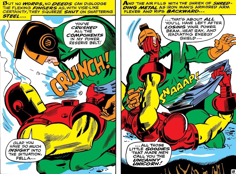 En cuanto a los villanos más “tradicionales”, tenemos al Unicornio. Sí, el Unicornio. Un nombre que hoy provoca una sonrisa automática, pero que en estas páginas se toma muy en serio a sí mismo. Y ahí está parte de la gracia. El personaje intenta ser una amenaza real, aumentando su poder y enfrentándose a Iron Man con determinación. ¿Lo consigue del todo? Bueno… digamos que lo intenta con ganas, que ya es algo. También aparecen figuras como el Gladiador (ese villano de Daredevil), que aportan variedad y refuerzan esa sensación de que el mundo de Iron Man está lleno de peligros diversos, aunque algunos duren lo que tarda Tony Stark en cargar los repulsores. El equilibrio entre villanos recurrentes y enemigos de paso es irregular, pero cumple su función: mantener la rueda girando.