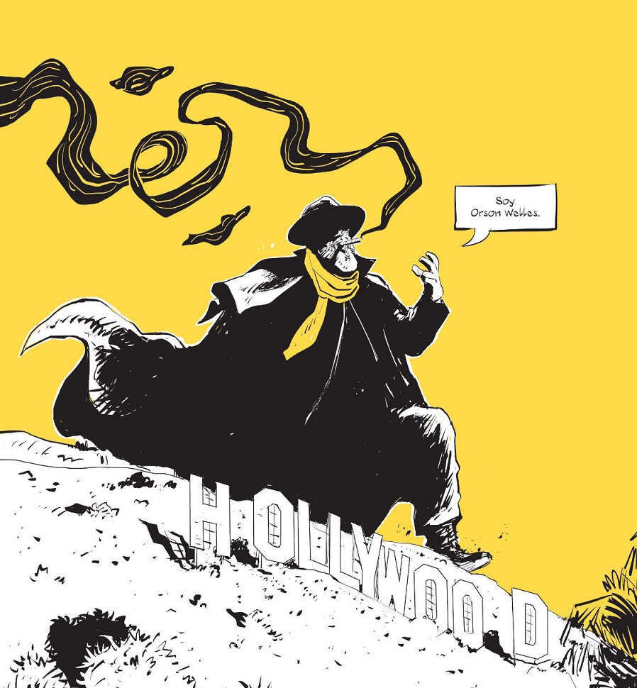 Por eso ver a Welles en este cómic entablar soliloquios como si fuera un personaje de Shakespeare nos parece, más que un recurso, un acierto en toda regla. Por todo lo que implica, simboliza y dimensiona a su figura. A modo de dialogo con el lector, el propio Welles nos va a llevar por su vida. Por ese torrente que con 23 años hizo “Ciudadano Kane”, por sus momentos poniendo voz a “La Sombra” (“The Shadow”) en su serial radiofónico, por el terror que despertó cuando se estrenó por radio “La Guerra de los Mundos”, por la descreída madurez artística con que enfiló el resto de su trayectoria, donde luchó para poder hacer el cine que el quería, y no el que “le demandaba el mercado”.