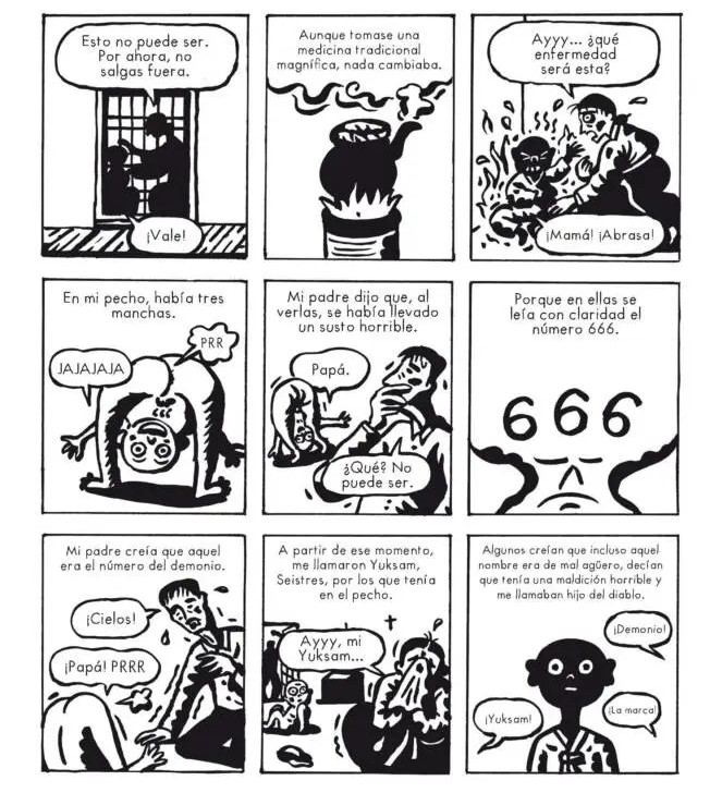 Park Kun-woong construye esta primera parte con una calma casi engañosa. El niño vive oculto, aprende a leer y escribir gracias a una niña (detalle clave, como veremos) y se desarrolla en un microcosmos donde la amenaza está siempre presente, pero nunca termina de materializarse del todo. Es como si el cómic estuviera conteniendo la respiración, esperando el momento adecuado para soltar el golpe. Y vaya si lo suelta. Porque este tebeo no es, en realidad, una historia sobre un niño con una marca inquietante. Es una historia sobre la violencia estructural, sobre la memoria histórica y, sobre todo, sobre la capacidad del ser humano para superar cualquier expectativa de horror que pudiéramos tener. Cuando la narración introduce el traslado forzoso de los aldeanos y la posterior masacre, la obra cambia de registro sin pedir permiso. Ya no hay espacio para metáforas cómodas: lo que vemos es brutal, directo y profundamente incómodo.