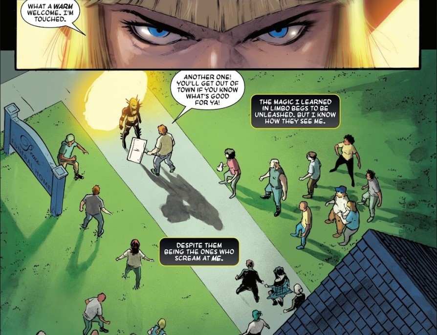 En paralelo a todo esto, tenemos la amenaza externa, encabezada por Liminal, un villano con nombre de grupo indie y aspiraciones de apocalipsis global. Liminal es ese tipo de antagonista que sobre el papel suena increíble: misterioso, poderoso, vinculado a fuerzas antiguas, pero que en la práctica se queda un poco a medio gas. No llega a ser olvidable, pero tampoco consigue robarle el protagonismo a Magik, lo cual, siendo sinceros, tampoco era fácil. Aun así, su presencia sirve como motor de la trama, como excusa para que haya peleas, viajes, rituales y todo ese catálogo de cosas que hacen que un cómic de este tipo no se convierta en una sesión de terapia demasiado cara.