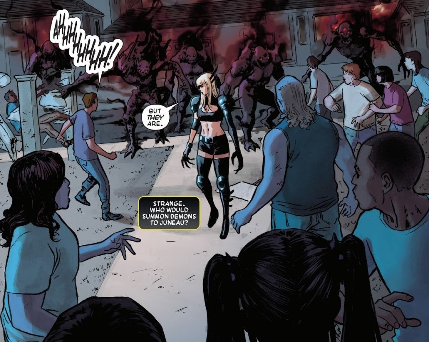 La historia arranca con una premisa que parece escrita por alguien que dijo “¿y si metemos TODO lo que mola en un cómic y ya luego vemos cómo lo ordenamos?”. Tenemos magia, tenemos el limbo, tenemos un mal antiguo despertando bajo la superficie y tenemos a Magik diciendo básicamente: “perfecto, me viene fatal, así que voy para allá”. Porque si algo define a Illyana es que su vida es una sucesión constante de situaciones incómodas que decide afrontar con una mezcla de sarcasmo, magia oscura y una espada que claramente no pasa controles de seguridad en ningún aeropuerto del mundo. Y así, lo que podría ser el inicio de una historia de terror lovecraftiano se convierte en una especie de locura demoníaca donde cada parada es peor que la anterior.