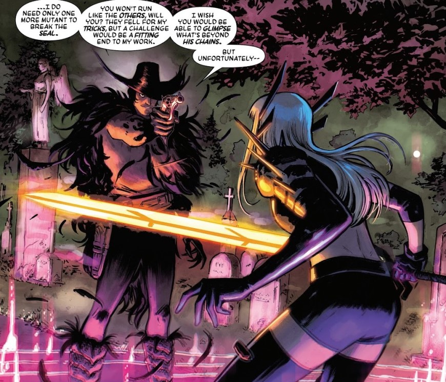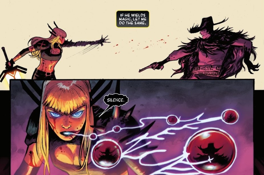Aquí es donde el cómic se pone interesante y también un poco repetitivo. Porque sí, la lucha interna de Magik es fascinante, pero también es algo que los lectores llevan viendo años. Es como ese amigo que siempre cuenta la misma anécdota en las cenas: al principio engancha, luego ya sabes cómo va a acabar, pero aun así lo escuchas porque tiene su gracia. El problema es que, en algunos momentos, el cómic parece apoyarse demasiado en ese conflicto sin aportar suficientes matices nuevos. No es que no funcione, es que a veces da la sensación de déjà vu.