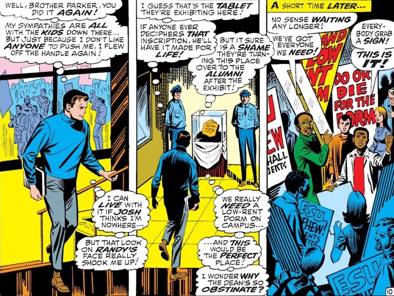 Puede que hoy en día este tipo de enfoque resulte algo exagerado, incluso un pelín teatral, pero funciona. Vaya si funciona. Porque Lee entiende perfectamente cómo construir tensión, y Romita sabe exactamente cómo convertirla en imágenes que se te quedan grabadas. Sus composiciones son más abiertas, más ambiciosas, casi pidiendo a gritos un formato más grande. Cada viñeta respira espectáculo, incluso cuando el guion aprieta en lo emocional. Y luego llegan los números de The Amazing Spider-Man, donde comienza la saga de “Crisis en el Campus”. Aquí el cómic amplía su alcance y mezcla la aventura clásica con un ligero aroma a comentario social. Entre persecuciones, enigmas y villanos con mala leche, aparece la figura de Randy Robertson liderando protestas estudiantiles y un Peter Parker que, sorprendentemente, no se queda al margen. Este detalle, pequeño pero significativo, le da al personaje una dimensión interesante. Ya no es solo el chaval que reacciona a lo que le pasa, sino alguien que empieza a posicionarse, a implicarse. ¿Es un cambio orgánico o una decisión editorial? Difícil saberlo, pero encaja bien dentro de esa evolución silenciosa que vive el personaje en esta etapa.