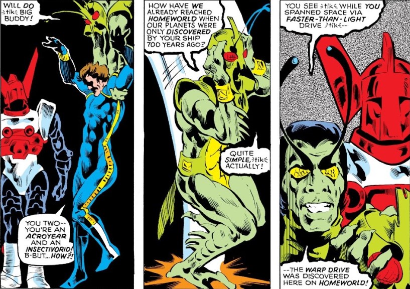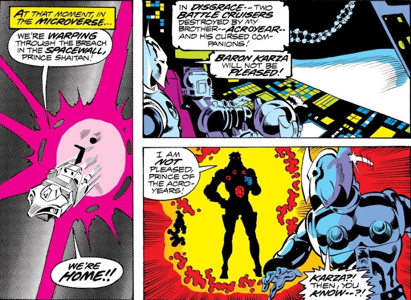 El grupo protagonista es un pequeño (literalmente) desfile de arquetipos bien aprovechados. Arcturus Rann, el explorador que regresa tras mil años de viaje, es el héroe clásico con un toque melancólico. Marioneta, princesa y líder de la resistencia, combina nobleza y determinación con una naturalidad que ya quisieran muchos personajes actuales. Acroyear, con su conflicto familiar digno de tragedia shakesperiana, aporta ese toque de drama que siempre viene bien. Biotrón y Microtrón que son robots pensantes que uno de ellos recuerda en cierto modo a R2D2. Y luego está Bicho. Ese personaje que parece diseñado para vender muñecos a niños y que termina siendo uno de los más carismáticos, divertidos y sorprendentemente humanos del grupo. Frente a ellos se alza Barón Karza, un villano que no se conforma con ser malvado: necesita ser teatral, opresivo y, si puede, ligeramente perturbador. Su régimen en Mundo Hogar no es solo una excusa para generar conflicto, sino una representación bastante clara de una sociedad desigual, donde los privilegiados viven eternamente mientras los demás sirven como piezas reemplazables. En un cómic basado en juguetes, pero si te adentras más allá de lo superficial nos encontramos con una gran crítica social.