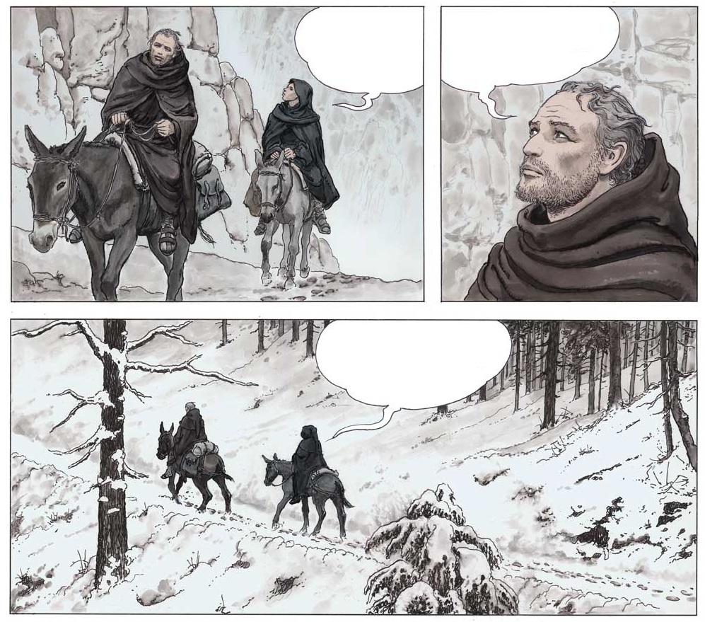 Un treball que, després d’haver vist la llum en dues entregues en varis idiomes, enguany Norma lo estrena en català en un format integral, i més gran que el tradicional del àlbum europeu, que permet gaudir amb mes intensitat de lo que espera en aquesta obra. Tot i que aquest còmic sea una adaptació, si estem parlant de Manara sempre hi ha un punt mes que fa del seu treball una cosa que cal gaudir amb la atenció que mereix. Cosa que, d’una altra banda, sempre ha passat. No hi ha mes que recordar títols com “El Clic”, “El perfume de lo invisible”, “Verano indio” o “Viaje a Tulum”. Tots amb un traç que deixa una empremta personal, com el que porten las seves dones tan característiques, tan pròpies i personals, amb un estil propi que les distingeix i singularitza de la resta del tot el còmic europeu. Però aquesta qüestió només es la punta de l’iceberg en quant a la mestria de Manara. I en el cas de “El nom de la rosa”, una historia protagonitzada bàsicament per homes, això es pot contemplar amb nitidesa.