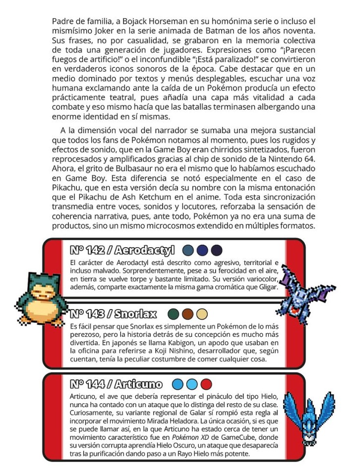 El tratamiento de los detalles es otro de los puntos fuertes. Aquí no se limitan a decirte que algo es curioso, sino que intentan explicarte el contexto detrás de cada decisión. Desde cambios de diseño en los Pokémon hasta limitaciones técnicas que condicionaron mecánicas enteras, pasando por ideas descartadas o errores que acabaron formando parte del juego. Todo se presenta como parte de un proceso creativo complejo, lleno de improvisaciones, soluciones ingeniosas y, en ocasiones, pura casualidad. Este enfoque convierte al libro en algo más que un simple homenaje. Es, en cierto modo, una reivindicación del videojuego como objeto cultural digno de análisis. Y lo hace sin caer en la pedantería ni en el exceso académico, algo que no siempre es fácil. Aquí hay rigor, pero también hay pasión. Y esa combinación es la que mantiene el interés a lo largo de sus casi 300 páginas.