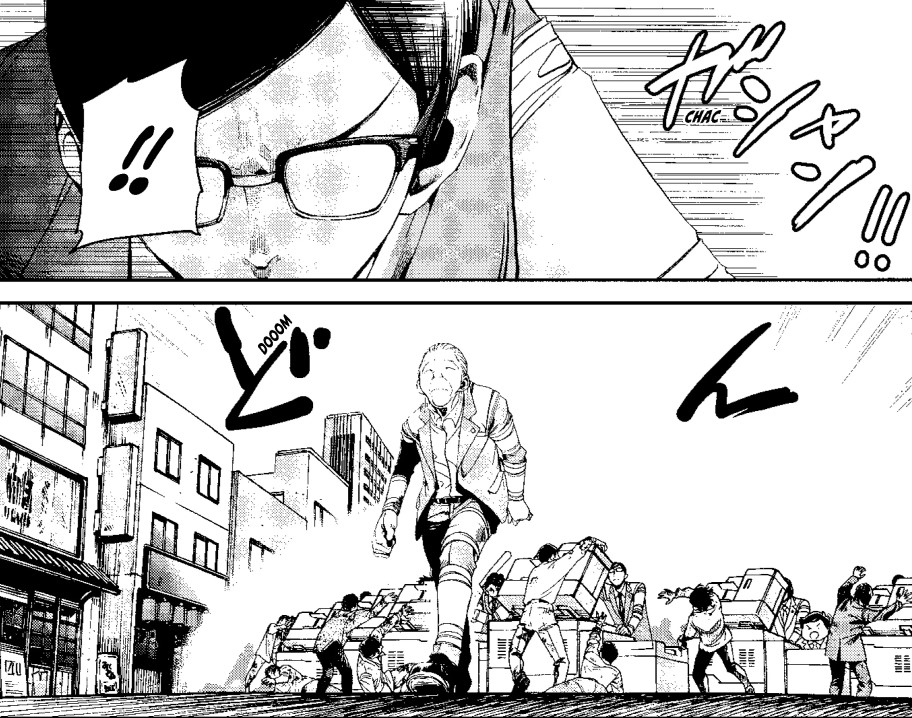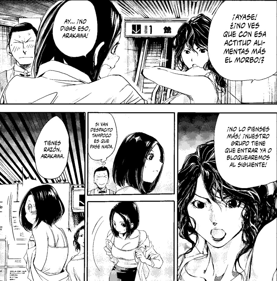 Por otra parte, en cuanto al dibujo, Ten Ishida sigue haciendo un trabajo notable. El contraste entre la rigidez de los personajes (siempre formales, siempre contenidos) y el caos del entorno es clave. Los zombis son grotescos, sí, pero casi parecen secundarios frente a la verdadera tensión: la de mantener la compostura. Hay viñetas donde el horror está en segundo plano, desenfocado, mientras en primer plano alguien discute procedimientos. Es brillante.