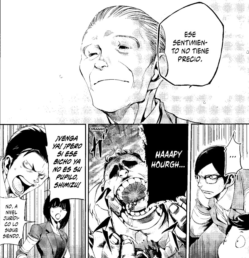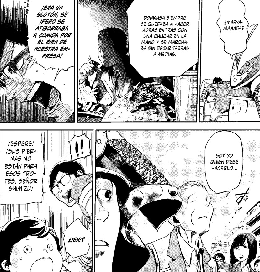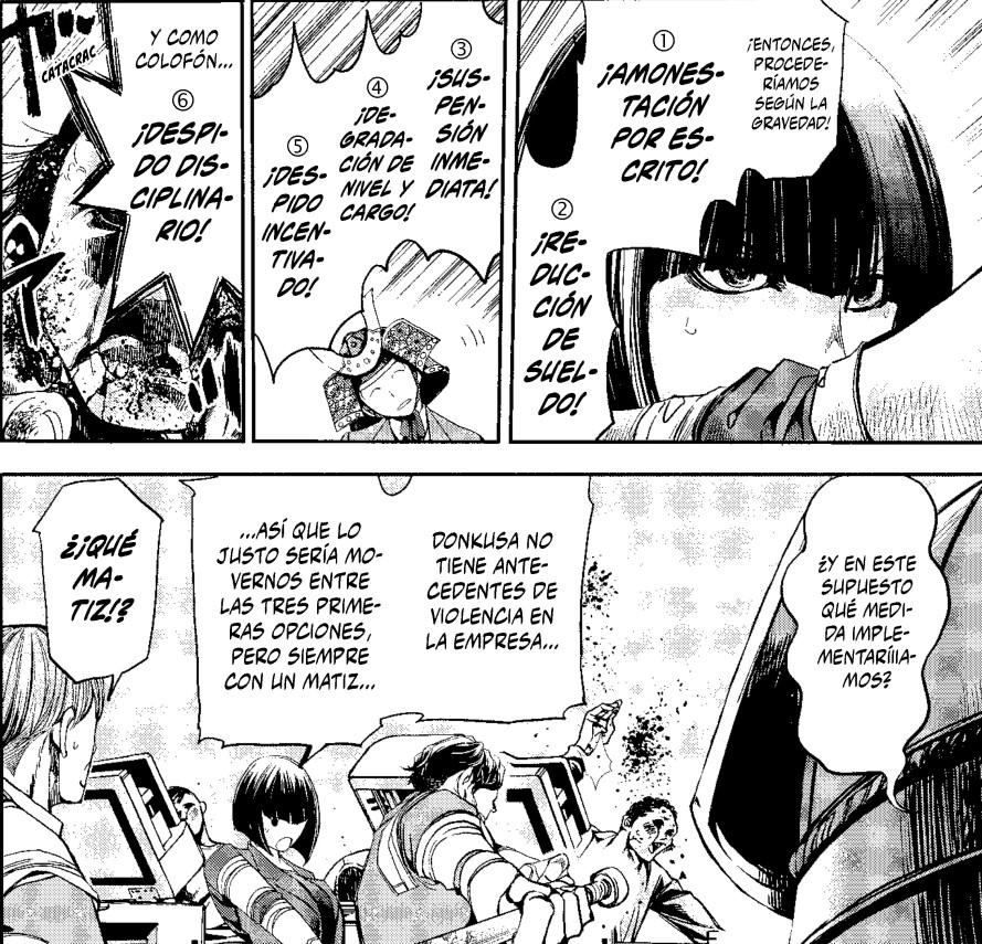 Lo brillante (y aquí viene lo inquietante) es cómo la trama nunca pierde ese tono de seriedad impostada. Nadie grita “¡corred, que nos comen!”. No. Aquí se habla de “gestionar la crisis”, de “optimizar recursos humanos” (aunque esos recursos estén perdiendo extremidades), y de “mantener la productividad en situaciones adversas”. Es decir, el lenguaje corporativo se convierte en una forma de horror psicológico mucho más eficaz que cualquier zombi babeante. Y en medio de todo esto, Maeyamada sigue siendo ese héroe improbable: un hombre de 40 años cuya mayor fortaleza no es su capacidad de combate, sino su ética laboral inquebrantable. Es el tipo de persona que, si le muerden, probablemente rellene un formulario antes de transformarse. Hay algo trágico en él, pero también profundamente cómico. Es el último samurái… pero con traje barato y maletín.